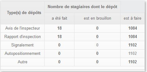 Affiche le nombre de dépôts en fonction de leur statuts et de leur types.
