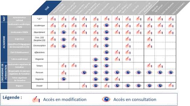 Ces profils standards sont créés par défaut dans l'application pour une académie donnée. L'ensemble est paramétrable (ajout de nouveaux profils, spécificités, etc) afin de décrire au plus près le flux de gestion de l'académie (cf. Profils).