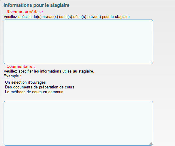 Via l'action "Saisir les informations du support", le Chef d’Établissement peut saisir des informations qu'ils souhaitent porter à la connaissance des stagiaires pour faciliter leur prise de fonction (niveaux d'enseignements, ...) :