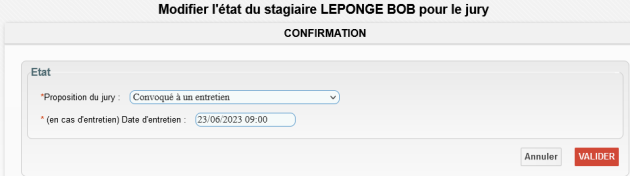 Attention, pour qu'une convocation stagiaire soit générée, il faut que la proposition du jury pour ce stagiaire soit positionnée à "Convoquée à un entretien" :