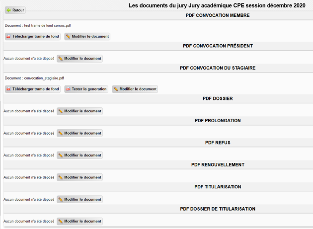 Permet de charger des documents templates spécifiques à la tenue des jurys (convocations, lettres, ...). Ces documents ne sont pas obligatoires au fonctionnement des Jurys dans l'application mais permettent l'utilisation de fichiers templates lors de différentes phases du Jury, par exemple pour les convocations des membres et du président du Jury, ou, pour la convocation des stagiaires à un entretien :