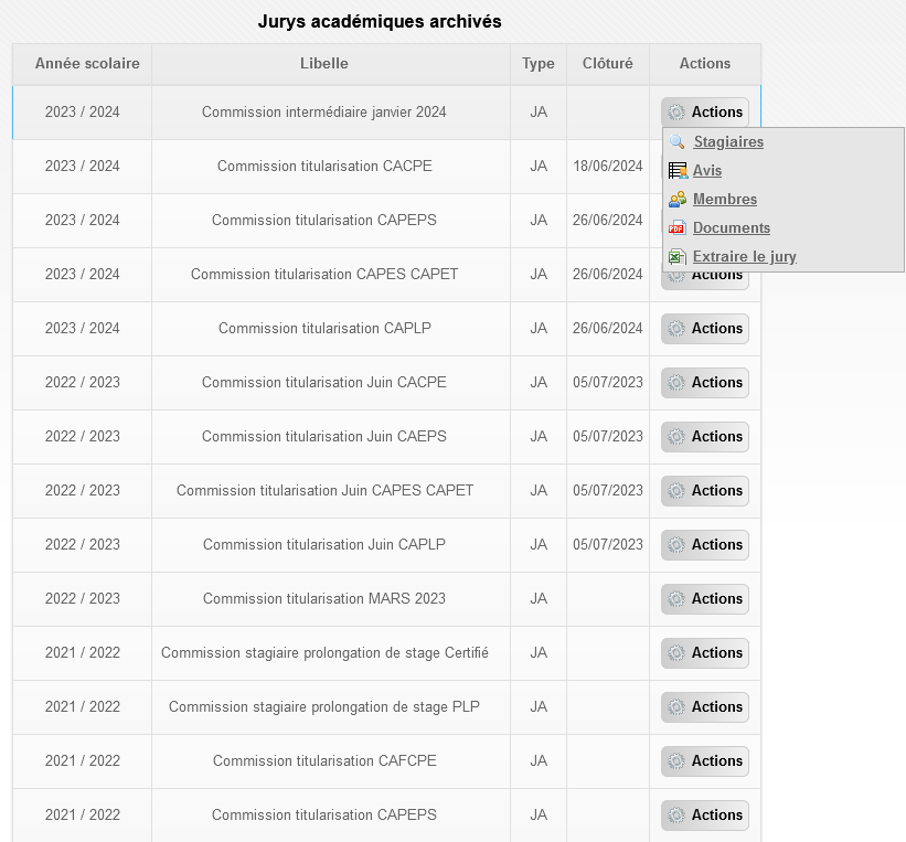 Liste des actions disponibles pour un jury donné (cf. Partie Gestion d'un jury).