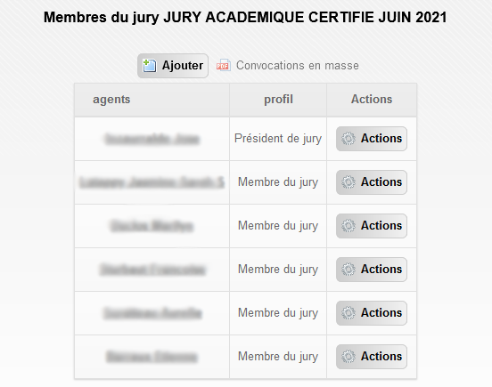 Une fois le jury créé, celui-ci apparaît dans la liste de l'écran initial du module jury. Les fonctionnalités principales sont disponibles via la bouton Actions :
