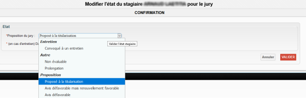 A la création du jury, ou à l'ajout d'un stagiaire, la saisie est par défaut à la valeur Proposé à la titularisation.