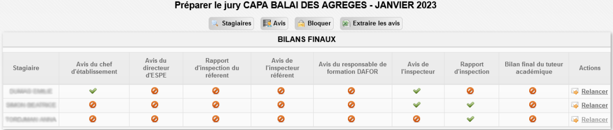 Permet d'accéder aux outils de préparation d'un jury : visualiser et/ou extraire les avis de celui-ci, et relancer les acteurs n'ayant pas encore déposé les documents nécessaires à la tenue du jury et ce, par stagiaire via le bouton Relancer :