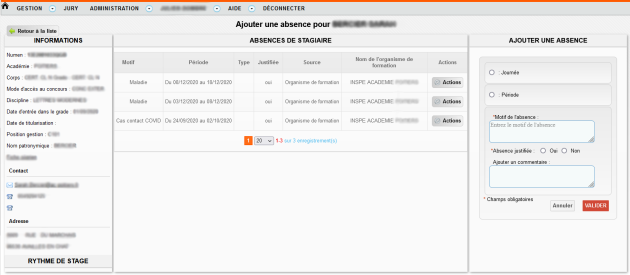 (cf. Administration des profils, chapitre 8.5). L'écran permet la consultation des absences par stagiaire remontées des SIERH :