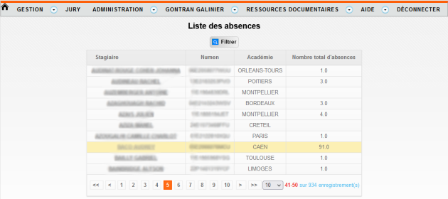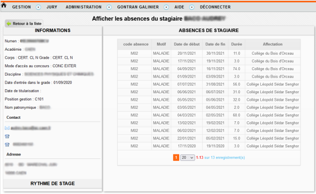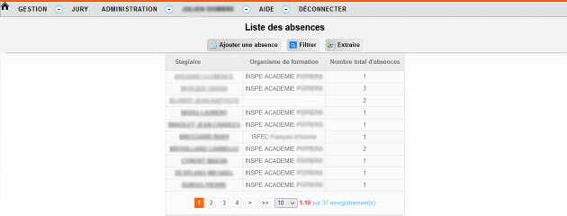 (cf. Administration des profils, chapitre 8.5). L'écran permet la consultation des absences par stagiaire remontées des SIERH :