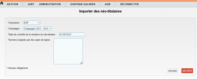 Cette fonctionnalité permet d'importer des néo-titulaires manuellement. Elle est accessible via le menu Gestion/Importer des néo-titulaire