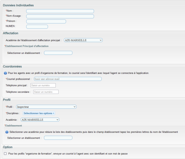 Le NUMEN n'est pas obligatoire dès lors que l'agent créé possède un type de profil lié à un organisme de formation (cf. Administrations des profils). Dans le cas contraire (très rare), celui-ci est obligatoire.