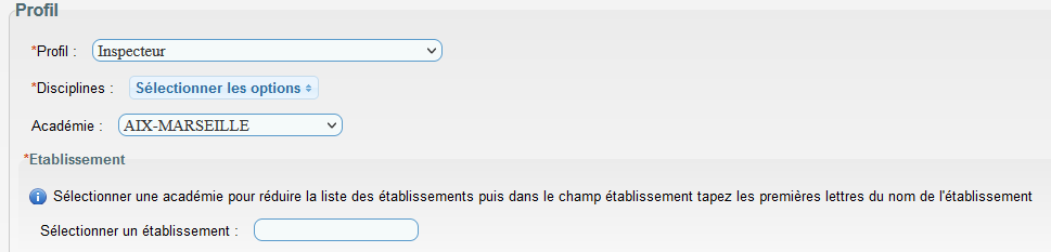 Sélection du profil à ajouter. La liste déroulante contient l'ensemble des profils existants de l'académie.