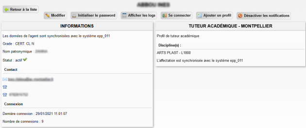 Connecter : permet de se connecter à la place de l'agent courant (simulation des droits, documents, etc). Cette option n'est disponible que pour les ADSI ou l'administrateur national.