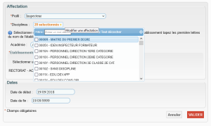 Dans ce las cas d'un inspecteur du 1er Dégré, son périmètre (visibilité des stagiaires) étant construit sur la circonscription (cf. profils), l'ajout de circonscription (affectation dédiée aux IEN, exemple :
