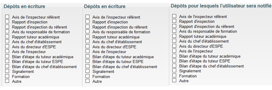 Cette partie permet de paramétrer pour le profil courant quels dépôts sont consultables, créables / modifiables, et pour lesquels les agents ayant ce profil seront notifiés (réception d'un email) lors du dépôt du dit document.