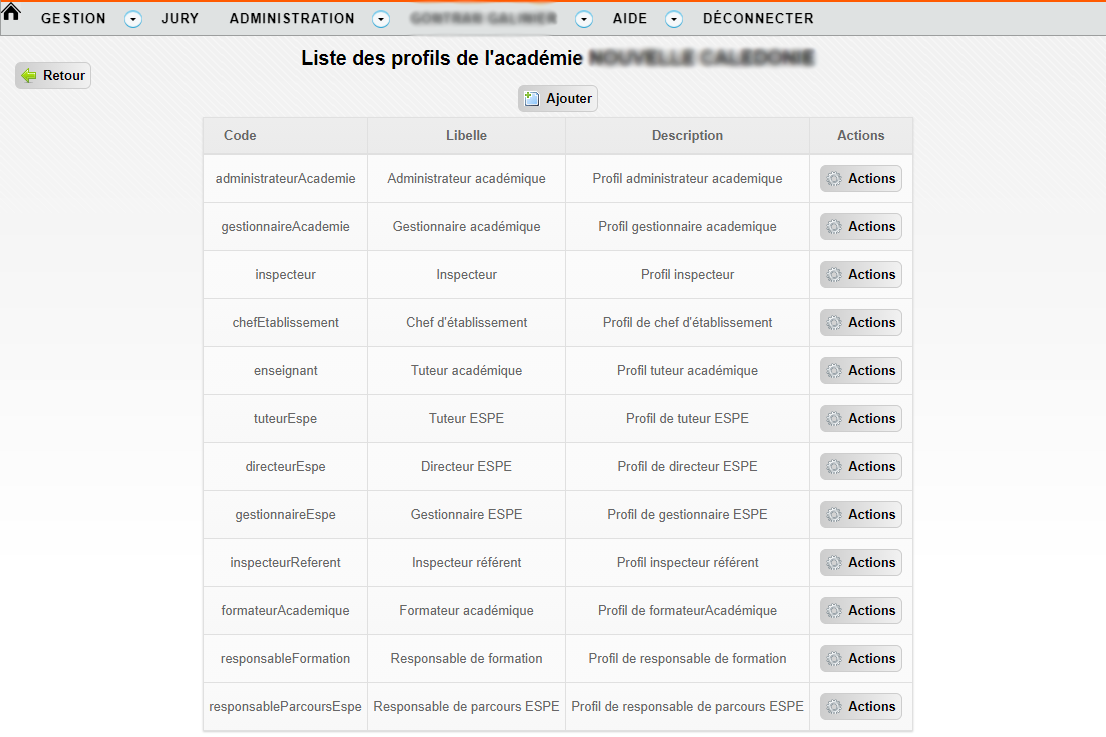 Le paramétrage de ces profils existe également par défaut. Il est nécessaire au bon fonctionnement de l'application dans votre académie : veuillez ne pas modifier les codes des profils (1ère colonne de l'écran ci-dessus) qui sont nécessaires aux programmes de synchronisation.