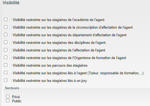 Si plusieurs cases sont cochées, la visibilité finale sera l'intersection des différentes visibilités (à l'exception de la case Visibilité restreinte sur les stagiaires liés à l'agent
